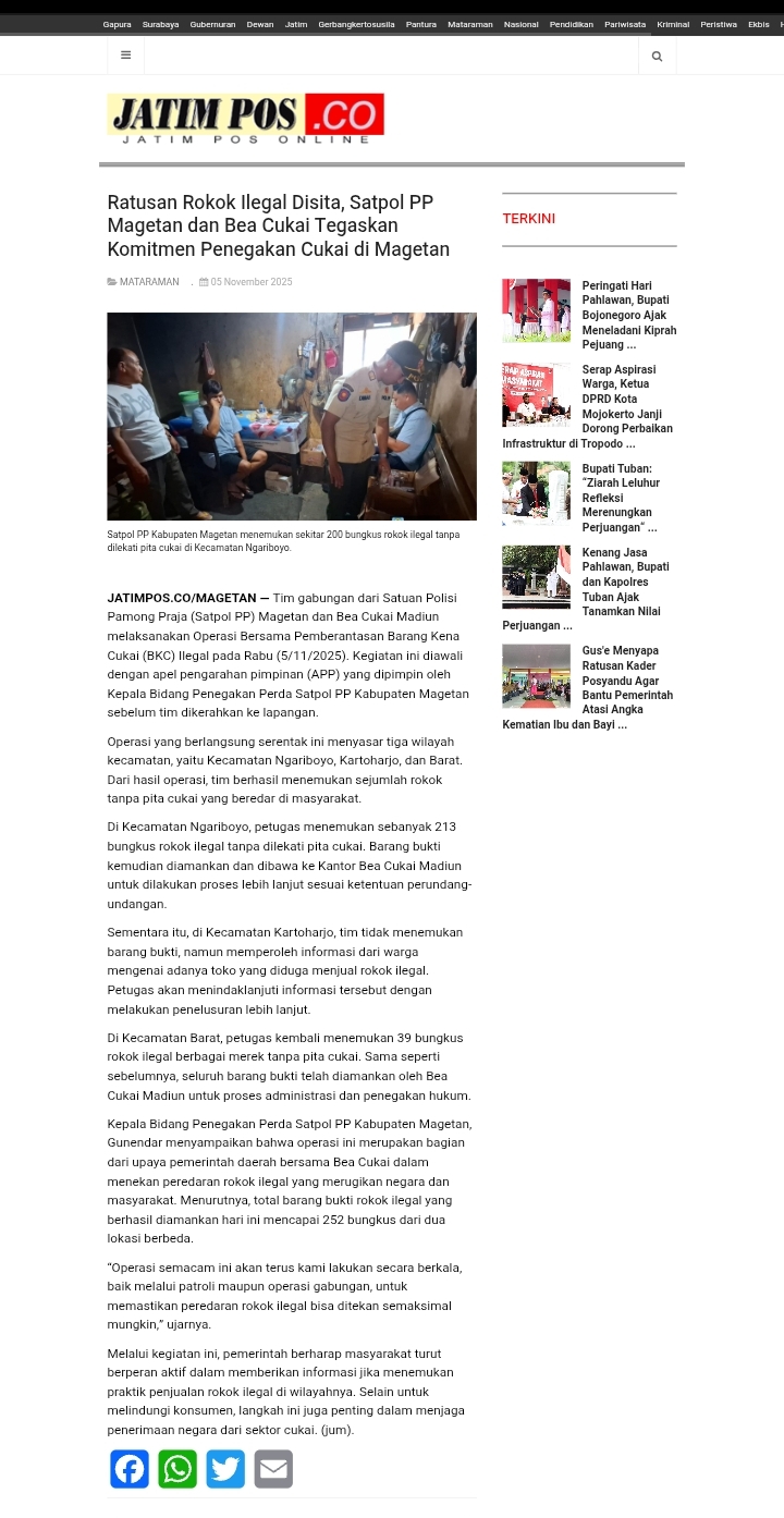 | 2 | JATIM POS (www.jatimpos.co) | Ratusan Rokok Ilegal Disita, Satpol PP Magetan dan Bea Cukai Tegaskan Komitmen Penegakan Cukai di Magetan | 05 November 2025 | Lihat | Lihat | Jumali | |