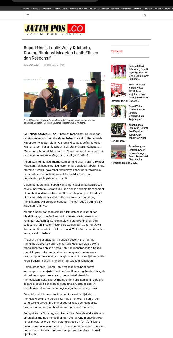 | 1 | JATIM POS (www.jatimpos.co) | Bupati Nanik Lantik Welly Kristanto, Dorong Birokrasi Magetan Lebih Efisien dan Responsif | 07 November 2025 | Lihat | Lihat | Jumali | |